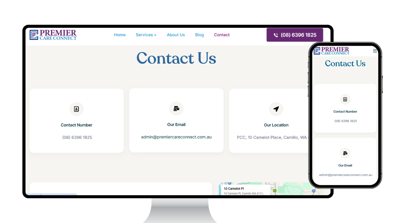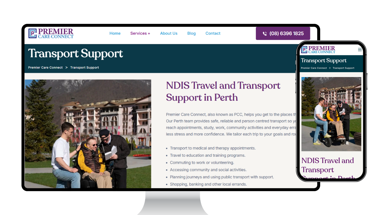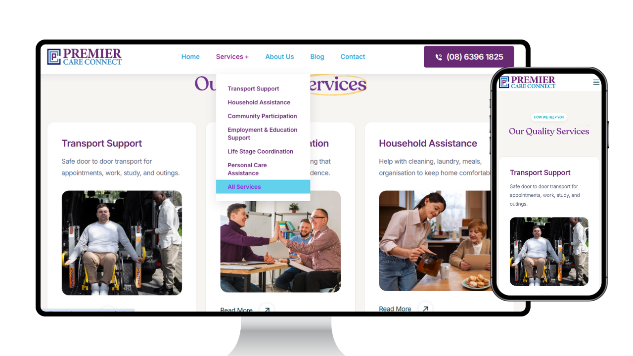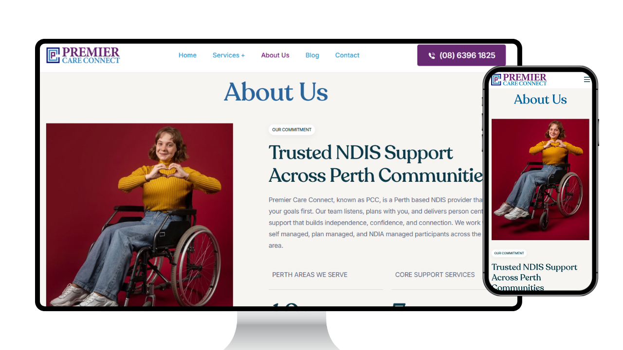 Premier Care Connect sought an online presence that reflected its person‑centred ethos and made it easy for NDIS participants to engage with services. They needed a complete brand identity from logo to colour palette and a website that communicated core support services, explained funding options for self‑managed, plan‑managed and NDIA‑managed participants, and delivered an inclusive user experience across Perth.
